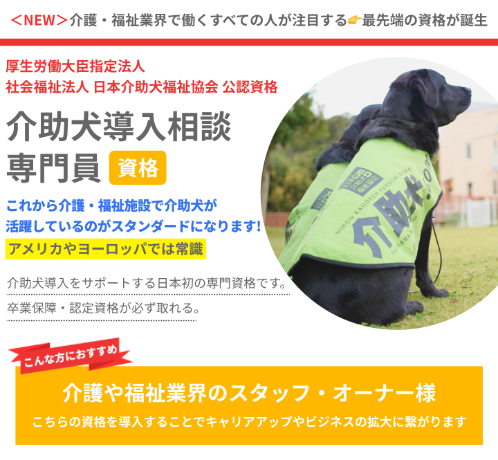 この資格は、医療機関や介護の現場で働く人で、既存の手段以外で身体障害者のQOLを向上させたい方、また、犬が好きで、将来的に犬にも関わりながら仕事をスキルアップさせてたいと考えている方に向けた新しい資格です。